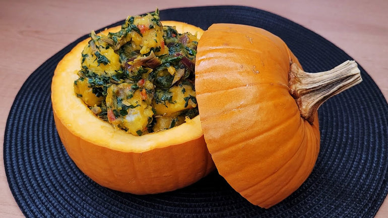 Serve with a chilled drink. You can see how I served it with a pumpkin “bowl”. If you want to do that then you need to buy two pumpkins. Watch the video below for details.